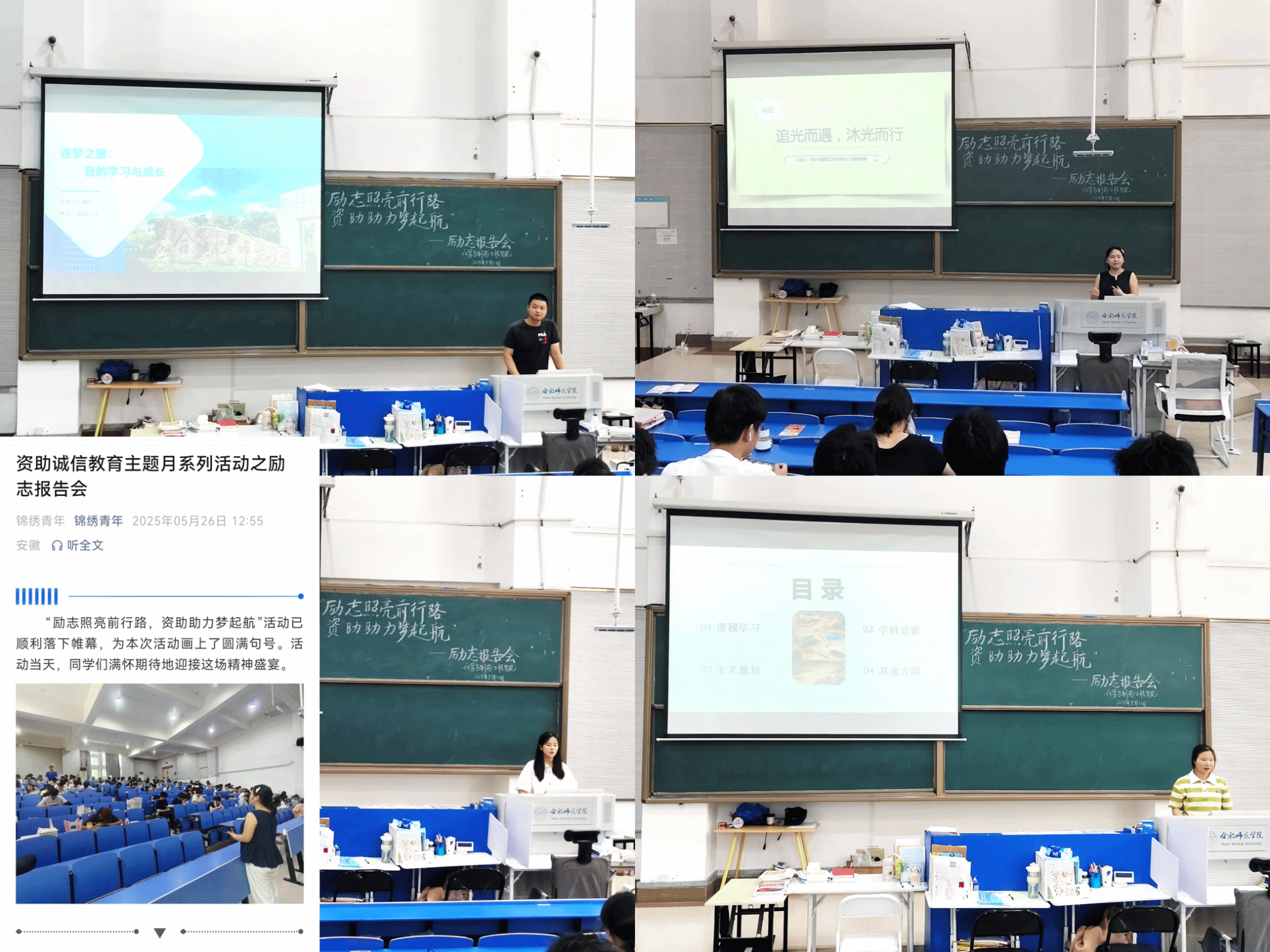 举办励志报告会。学院分别于4月和5月在逸夫楼西阶教室举办国家奖学金、国家励志奖学金获得者经验分享会和优秀毕业生励志经验分享会。组织获奖获助的优秀学生介绍自己在国家资助政策帮助下的成长历程,如何安心学习、健康成长、青春出彩,展现自己自强不息的奋斗精神,教育引导学生自立、自信、自强。两次励志报告会累计参与800余人次。