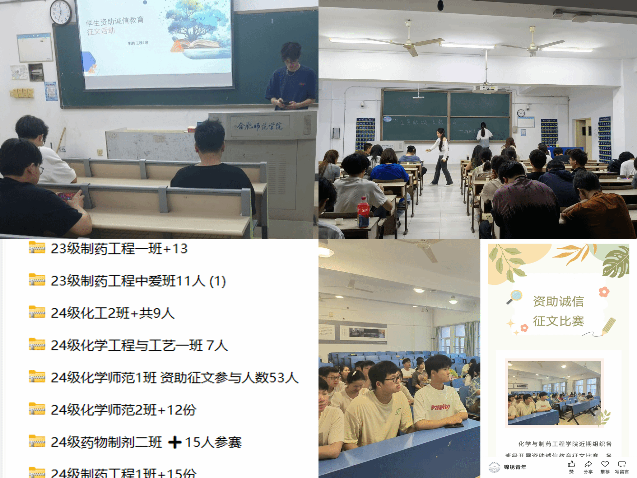 举办诚信征文活动。通过线上、线下相结合的方式,学院组织各班级围绕“诚信、感恩、励志”开展资助诚信教育征文比赛。各班级结合国家资助政策对个人成长的影响,积极通过第二课堂申报活动,收集作品,评选优秀作品给予表彰与奖励。征文活动线下开展24场,参与学生300余人。本次征文比赛以文字为载体,宣传了资助政策,深化了诚信教育,营造了良好氛围。