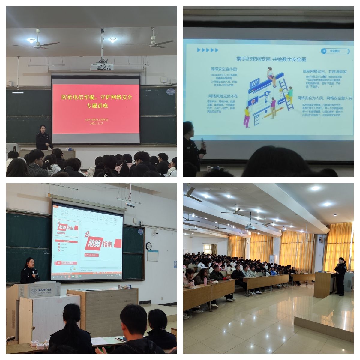 活动现场,经开分局的胡警官和戴警官先后开展了《携手织密网安网,共绘数字安全图》和《防骗指南》两场讲座。讲座中两位警官结合具体案例,以案说法,通过播放案例视频、分析近期诈骗案件笔录、现场讲解诈骗手段等方式,形象生动地介绍了电信网络诈骗的主要类型、惯用手段以及防范措施,并结合多年办案经验总结了一图看懂式的诈骗识别方法。