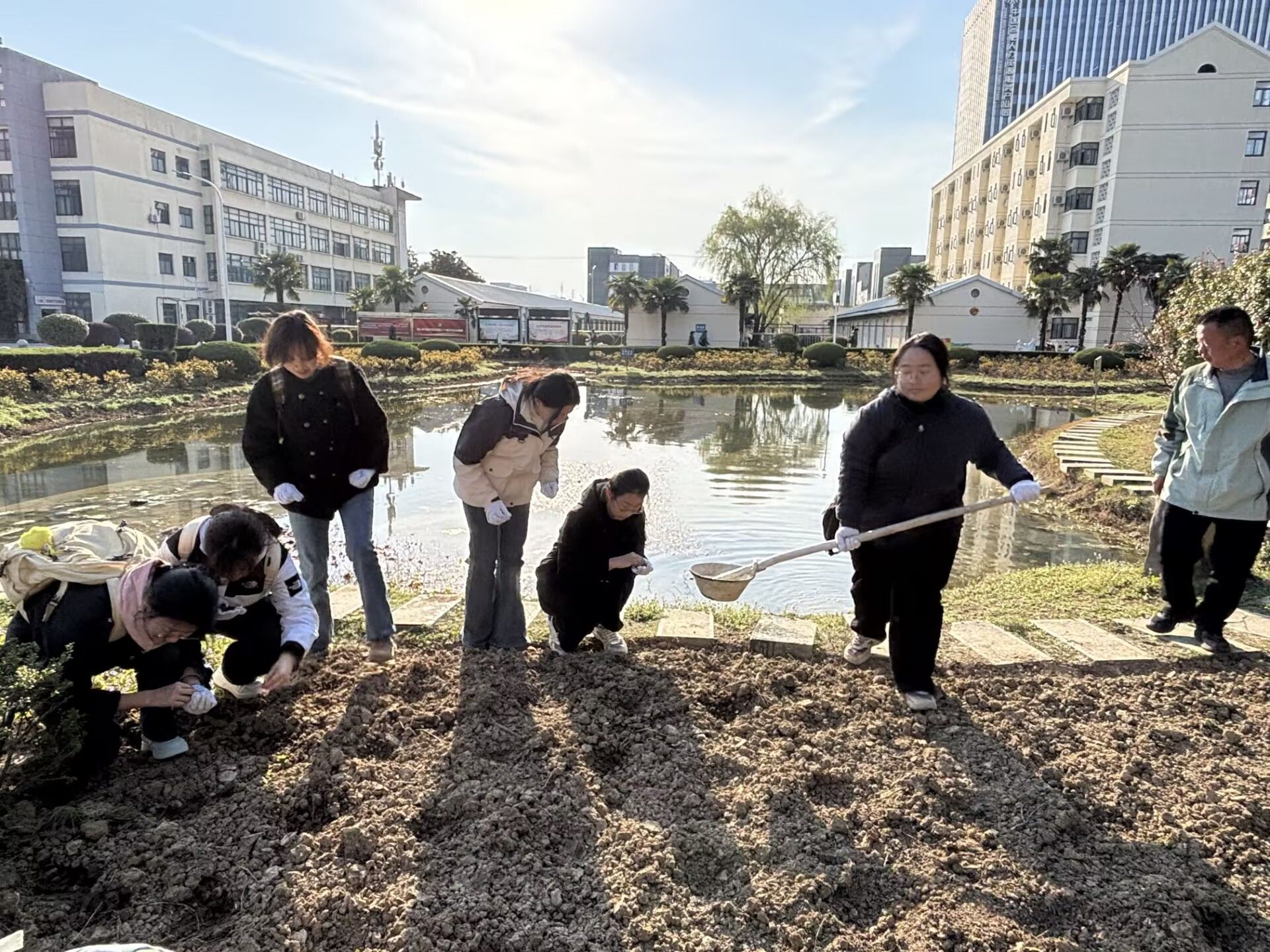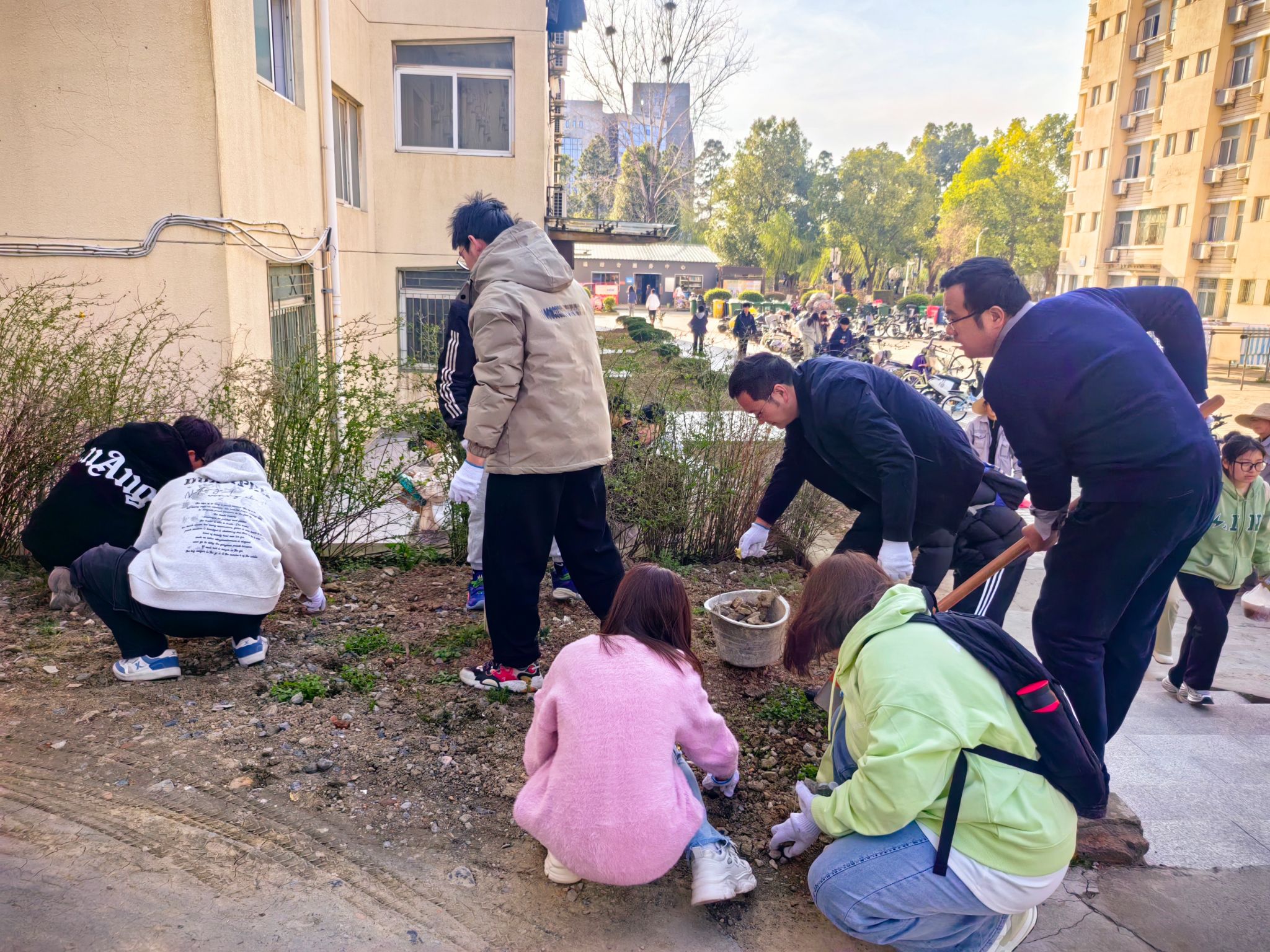 2024级同学们以班级为单位,在后勤处指导下分工合作,积极参与到学生公寓石子路铺设、柳林花田种植以及月牙湖百日红生态长廊共建等项目中。大家团结协作、分工明确,用心地捡拾碎石、细心地播种花籽、耐心地栽种苗木,在劳动实践中美化校园并培养吃苦耐劳的能力。